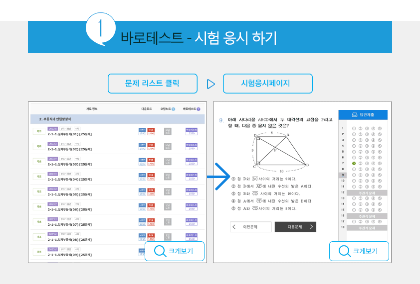 ÄÜÅÙÃ÷ ¸®½ºÆ®¿¡¼­ ¡°¹Ù·ÎÅ×½ºÆ®¡± ¹öưÀ» Ŭ¸¯ÇÏ¿© ½ÃÇè¿¡ ÀÀ½ÃÇÒ ¼ö ÀÖ½À´Ï´Ù. ½ÃÇè ÀÀ½Ã È­¸é¿¡¼­´Â ÇÑ ¹®Ç× ¾¿ È®ÀÎÀÌ °¡´ÉÇϸç, ´ä¾ÈÀº OMR ¶Ç´Â ¹®Á¦ÀÇ º¸±â¿¡ ¹Ù·Î Ŭ¸¯ ÇØ¼­ ÀÔ·ÂÇÒ ¼ö ÀÖ½À´Ï´Ù. ¸ðµç ¹®Á¦ÀÇ Á¤´äÀ» ÀÔ·ÂÇÑ ÈÄ¿¡ ¹Ù·Î äÁ¡ÀÌ °¡´ÉÇϸç, äÁ¡ °á°ú¿¡ µû¶ó ¿À´ä ³ëÆ®¿Í À¯»ç¹®Ç×À» È®ÀÎÇÒ ¼ö ÀÖ½À´Ï´Ù.