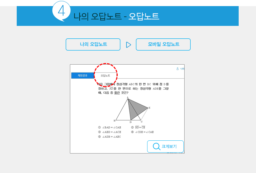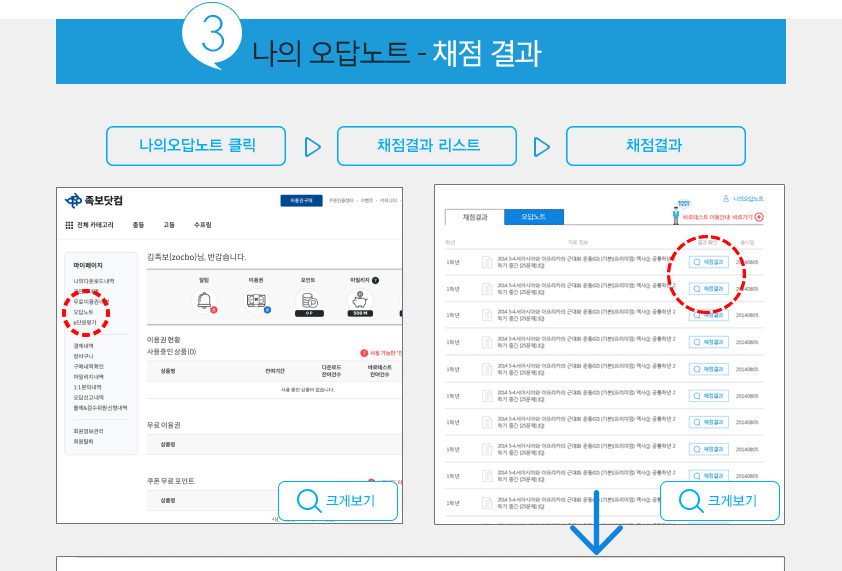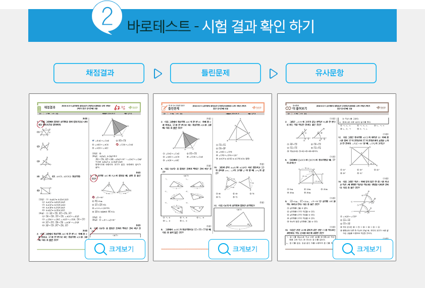 ½ÃÇè ÀÀ½Ã ÈÄ ½Ç½Ã°£À¸·Î ´ä¾È äÁ¡ ¹× äÁ¡ °á°ú¸¦ È®ÀÎÇÒ ¼ö ÀÖ½À´Ï´Ù. äÁ¡ °á°ú È­¸é¿¡¼­ ¹®Á¦ÀÇ Á¤´äÀ» È®ÀÎÇÒ ¼ö ÀÖ½À´Ï´Ù.(ÀϺΠÆÄÀÏ¿¡ ÇÑÇØ ÇØ¼³ Á¦°ø) äÁ¡ÀÌ ¿Ï·áµÇ¸é °á°ú¿¡ µû¶ó Ʋ¸° ¹®Á¦ º¸±â, Ʋ¸° ¹®Á¦¿¡ ´ëÇÑ À¯»ç¹®Ç× º¸±â°¡ °¡´ÉÇÕ´Ï´Ù. äÁ¡ °á°ú¿Í Ʋ¸° ¹®Á¦, À¯»ç¹®Ç×Àº ¸ðµÎ ÆÄÀÏ·Î ÀμⰡ °¡´ÉÇϹǷΠ½Ç·Â Çâ»óÀ» À§ÇØ Æ²¸° ¹®Á¦, À¯»ç ¹®Ç×À» ²À È®ÀÎÇϼ¼¿ä.